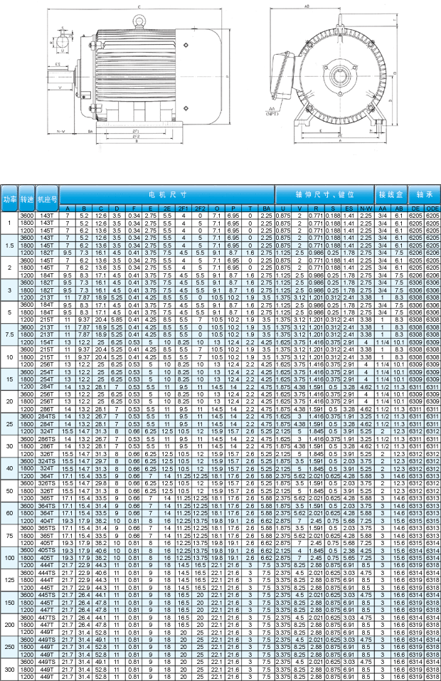 該系列電機為全封閉自扇冷式三相異步電動機,符合美國電氣制造商協會Nema的相關標準,電機采用F級絕緣,尼馬B設計或C設計,功率范圍從1馬力到300馬力,涵蓋2、4、6、8極,產品已獲得美國及加拿大政府的相關能效認證,證書號CC0082A及EEV2234888,亦獲得UL及CSA安全認證。